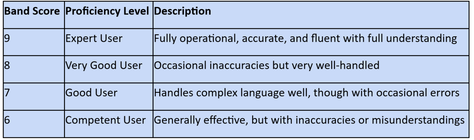 ● If the average score ends in .25, it’s rounded up to the next half band (e.g., 6.25 becomes 6.5).
