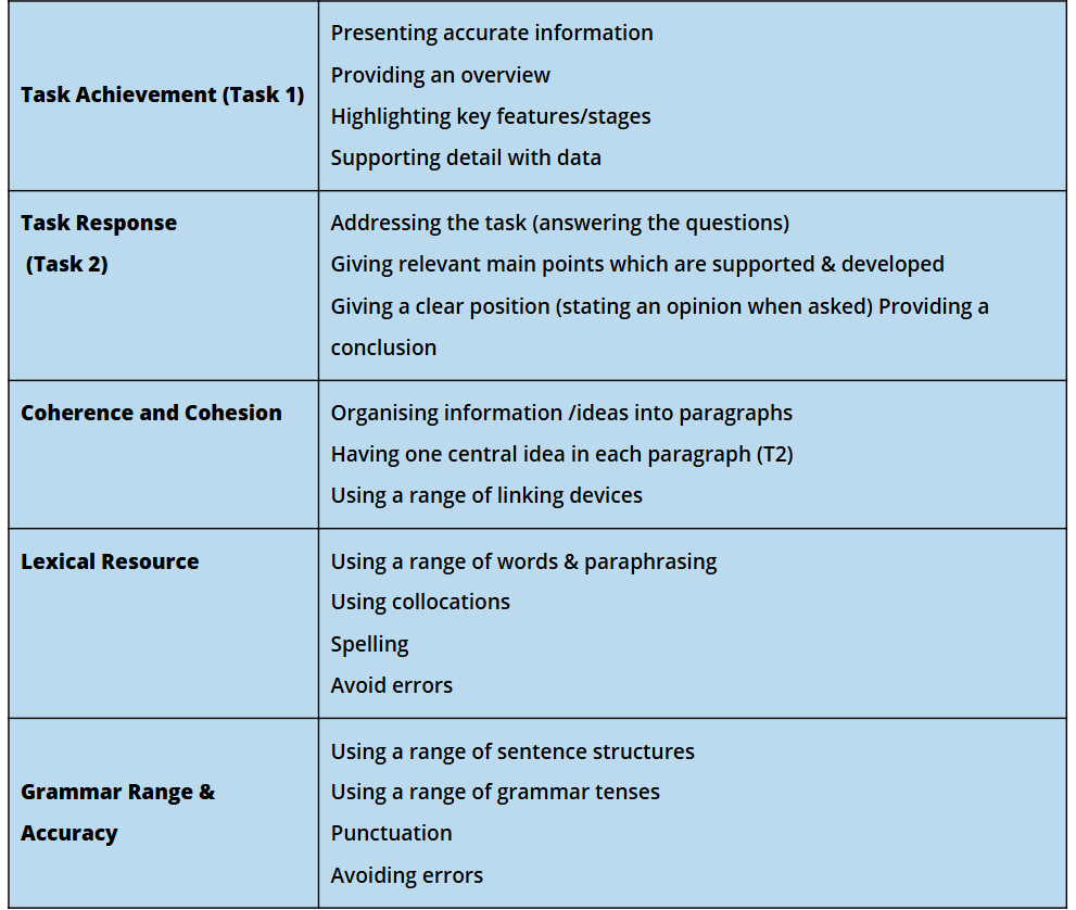 o Task Achievement (Task 1) / Task Response (Task 2)